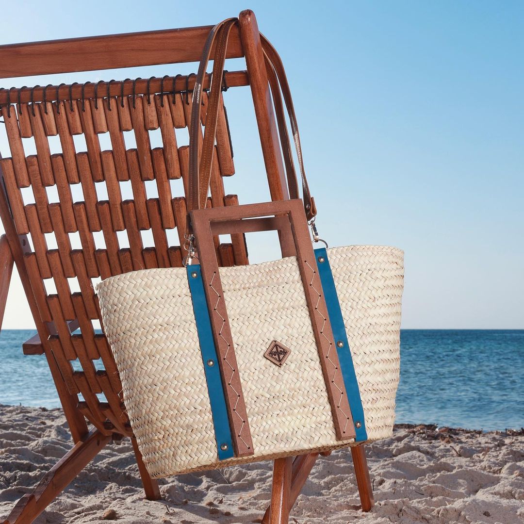 Son tressage délicat en feuilles de palmier naturelles est rehaussé de larges anses rectangulaires en cuir et bois, soulignées d’une bande bleu azur qui rappelle la mer Méditerranée.