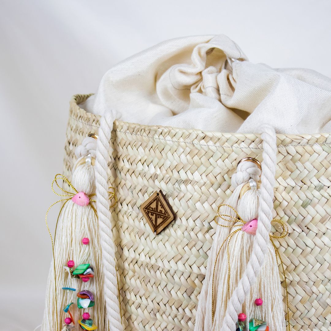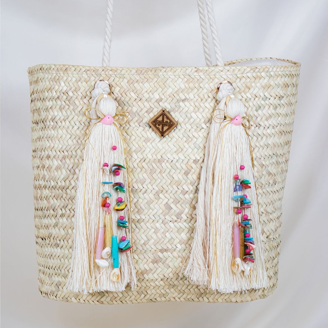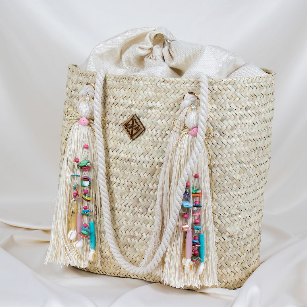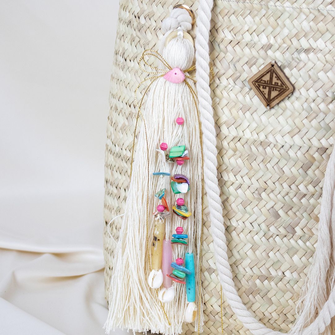 Tressé à la main en feuilles de palmier naturelles, il se distingue par ses pampilles en fil écru, ornées de pierres colorées, de coquillages et de perles dorées, rappelant les trésors d’un lagon ensoleillé.