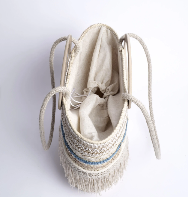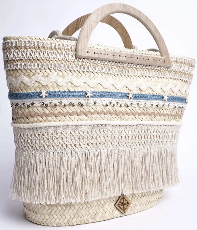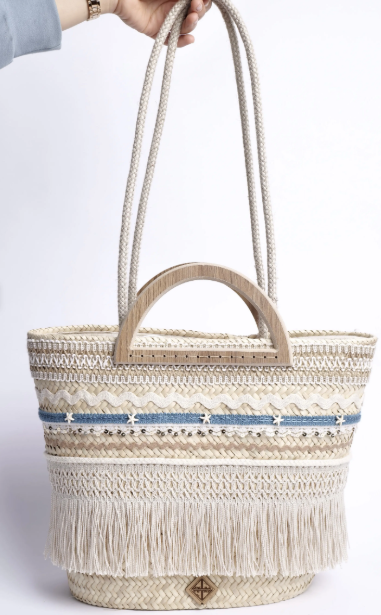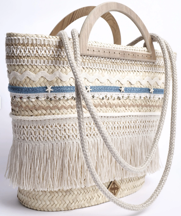 Son tressage artisanal en feuilles de palmier naturelles se pare d’un jeu subtil de textures : macramé délicat, franges de coton et broderies azurées rappelant la mer et le ciel du Sud.