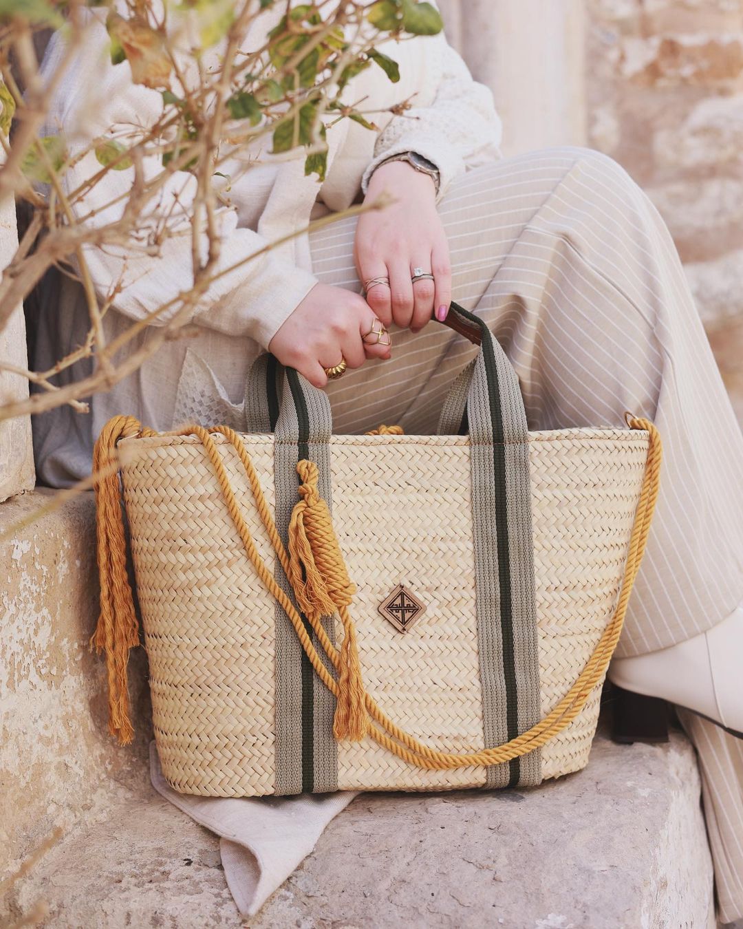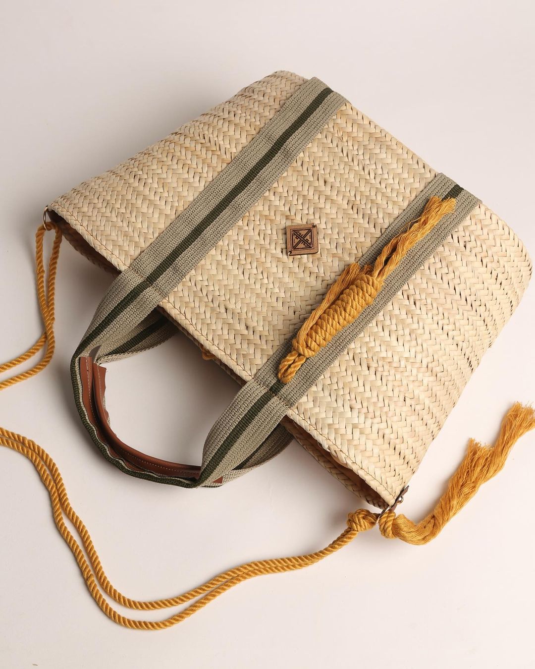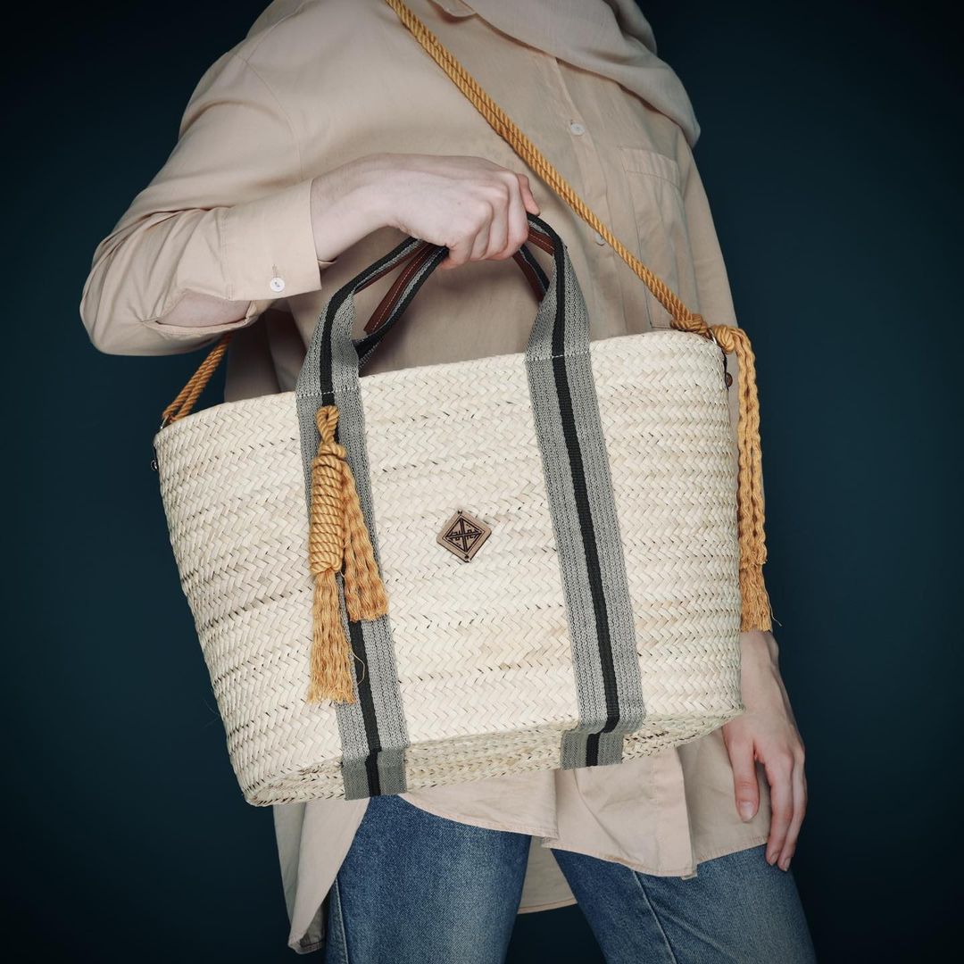Son tressage en feuilles de palmier naturelles se marie à des anses tissées en coton gris et beige, sublimées par de longs cordons dorés à la main, rappelant les rayons du soleil au cœur du désert.