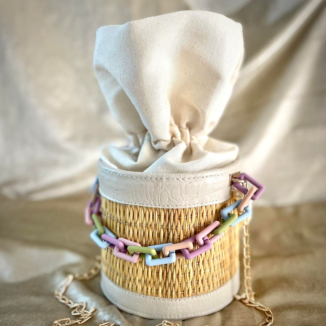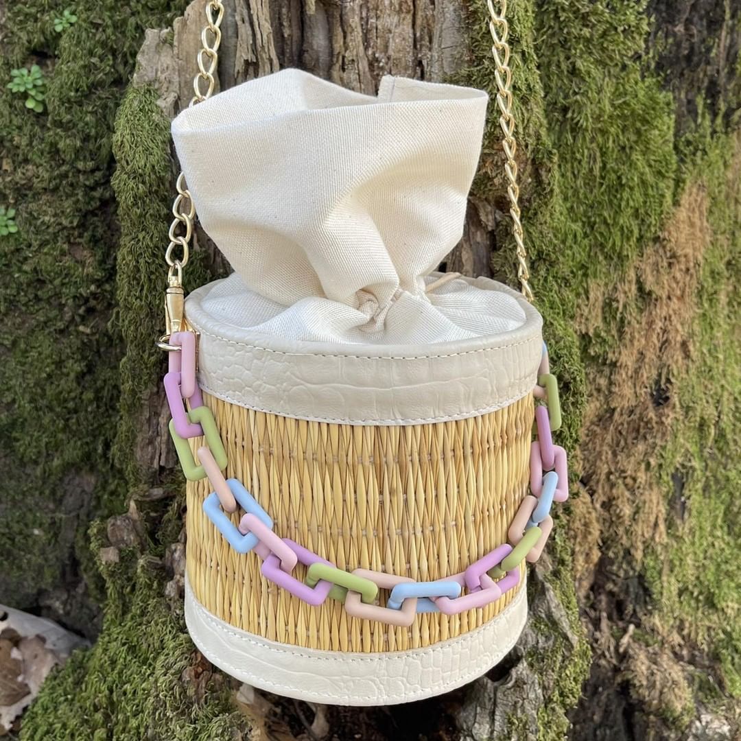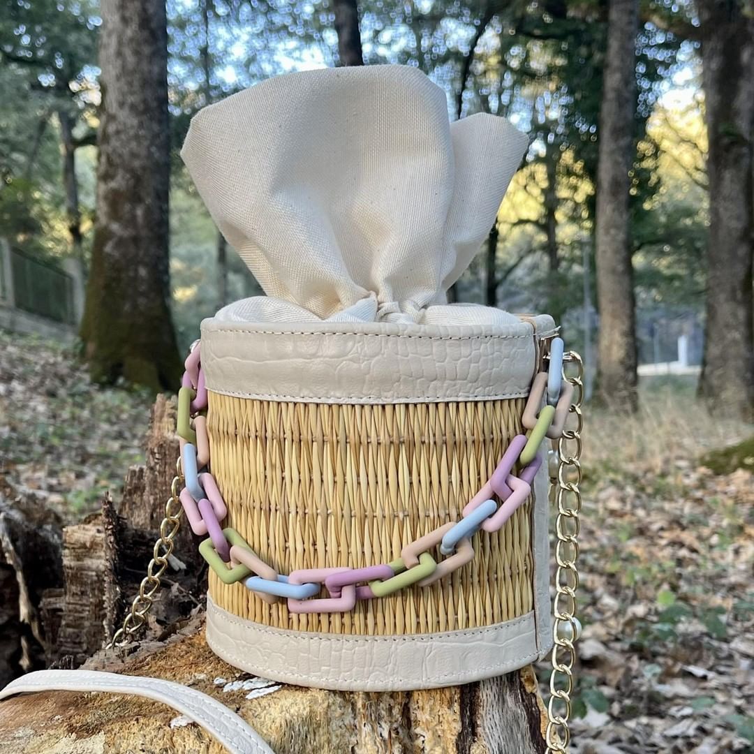 Sa forme cylindrique tressée à la main en fibres naturelles s’accompagne d’une chaîne colorée aux tons pastel — lilas, vert, rose et bleu — pour une touche moderne et joyeuse.