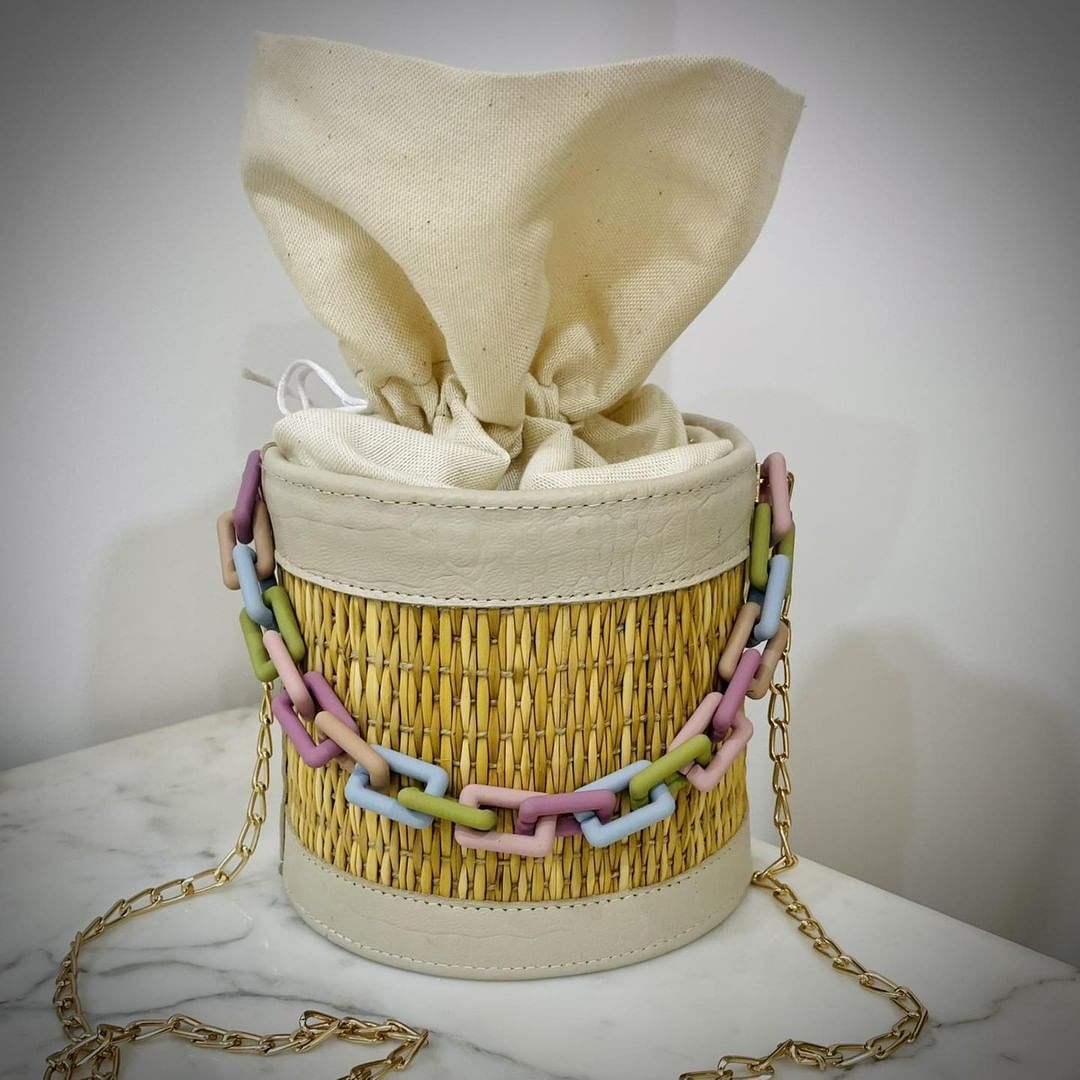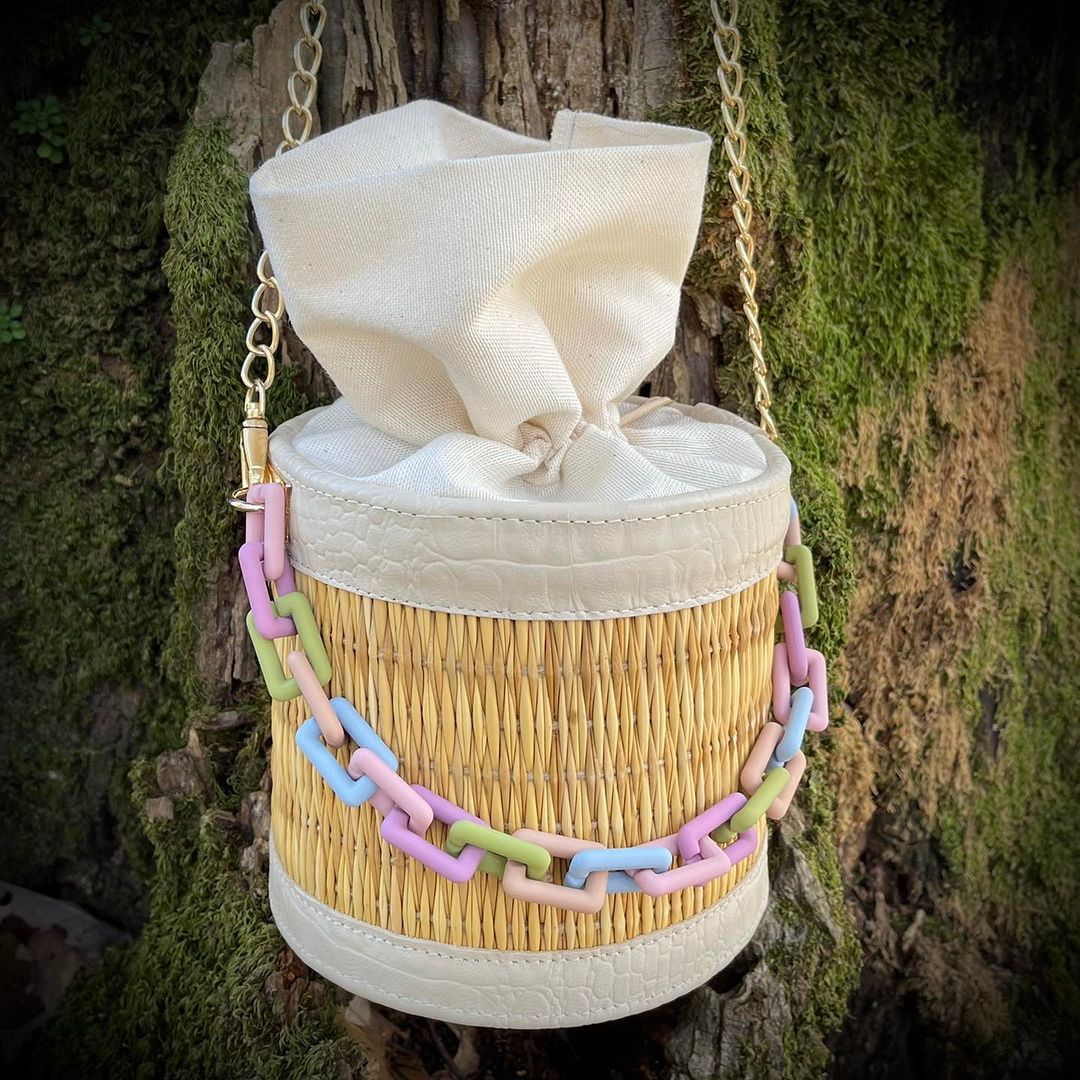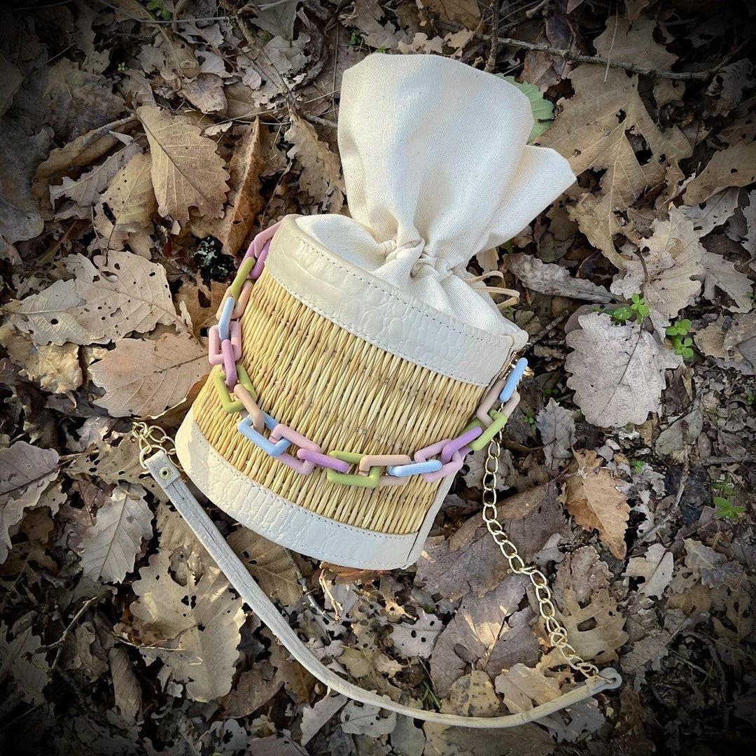Sa forme cylindrique tressée à la main en fibres naturelles s’accompagne d’une chaîne colorée aux tons pastel — lilas, vert, rose et bleu — pour une touche moderne et joyeuse.