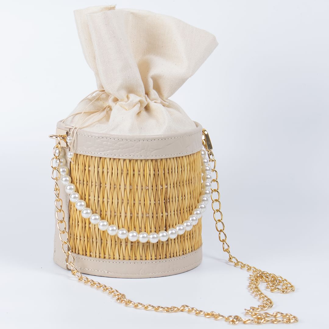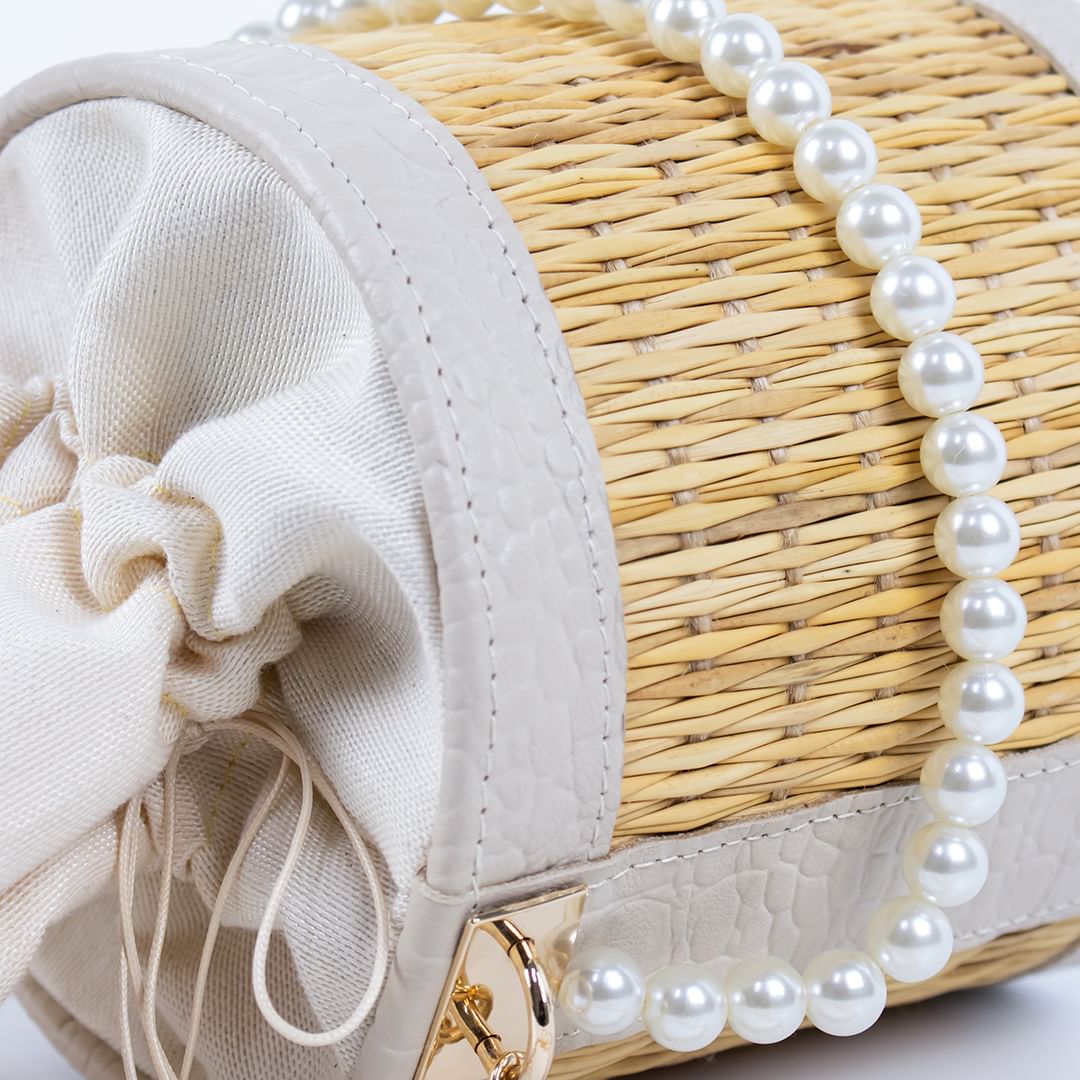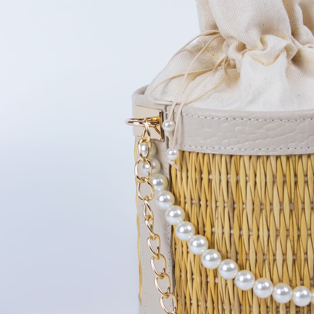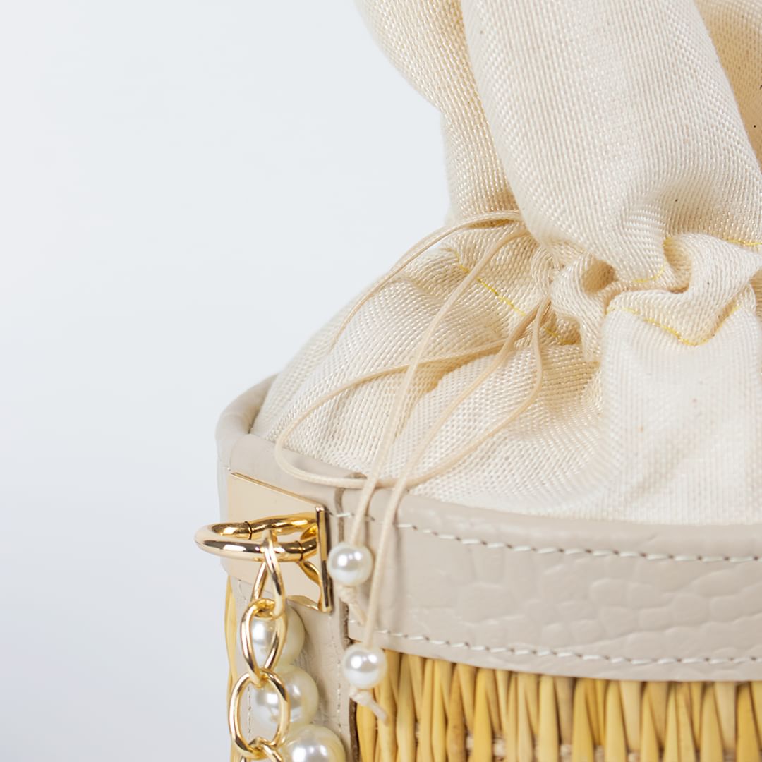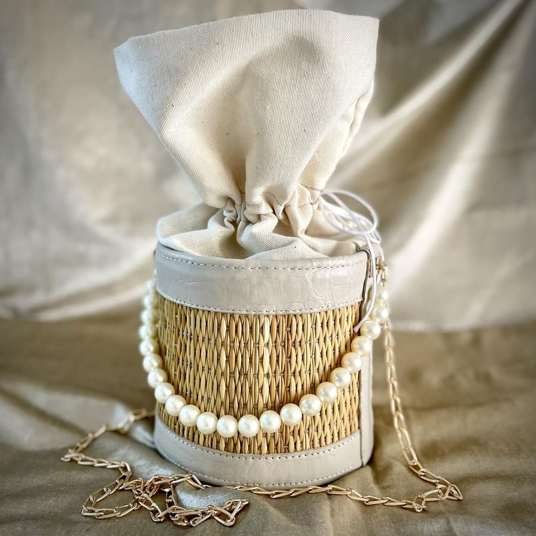 Son tressage cylindrique en fibres naturelles, associé à des finitions beige nacré et une anse de perles blanches, évoque la lumière des dunes au lever du soleil.
