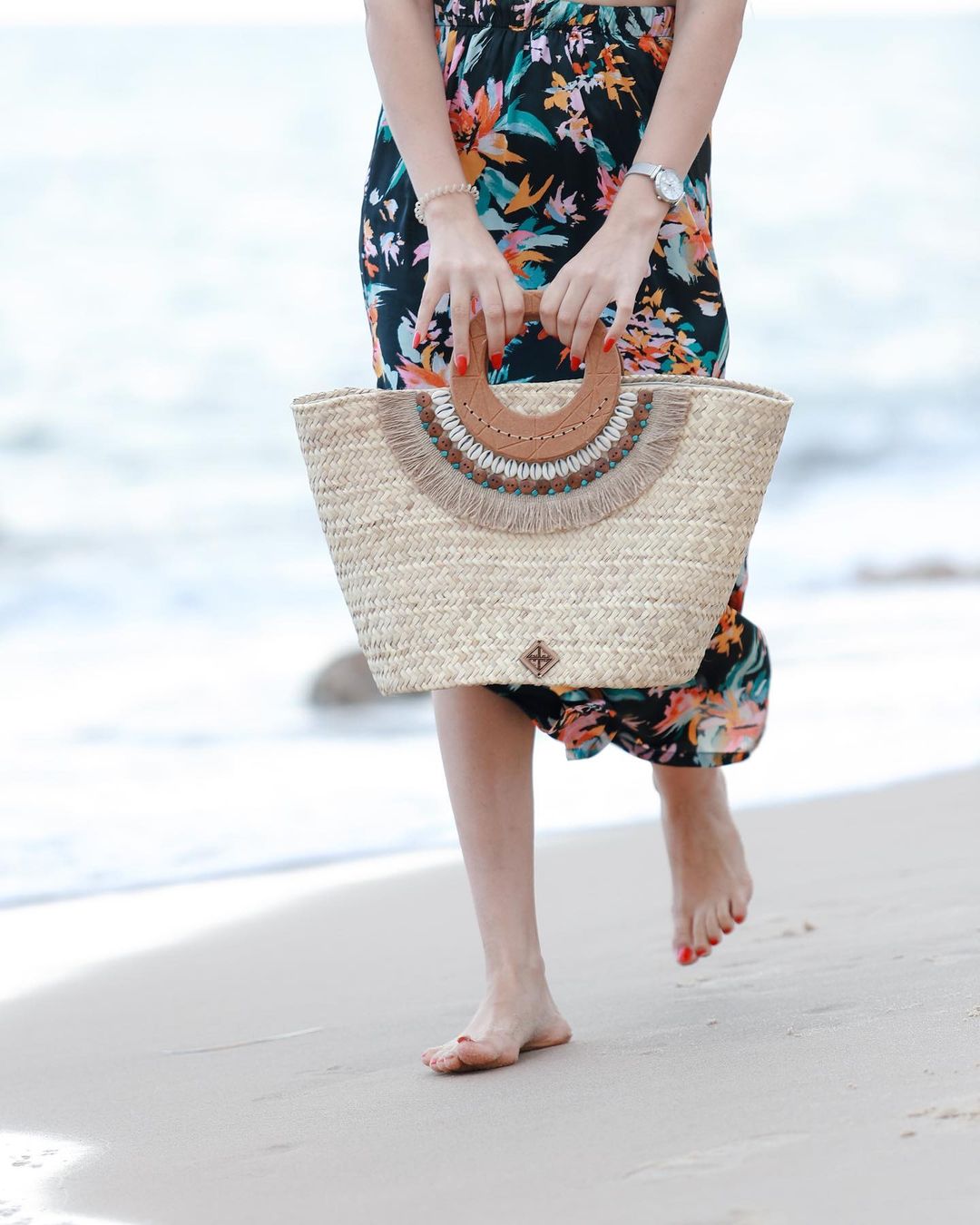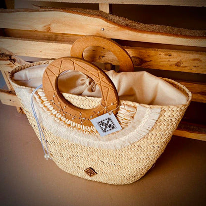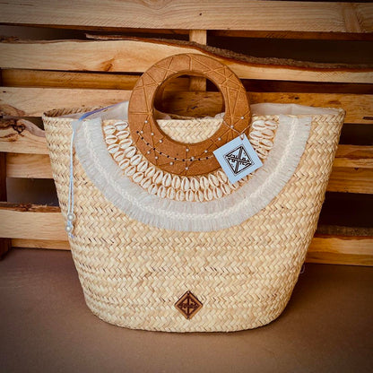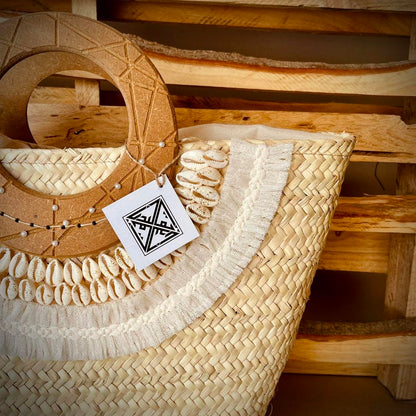 Tressé à la main en feuilles de palmier, il séduit par ses anses rondes en bois gravé et son ornement délicat de coquillages cauris et de perles nacrées.