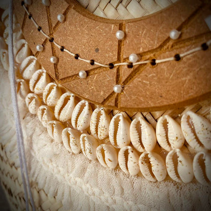 - Ornement de coquillages cauris et perles nacrées cousus sur une base textile ivoire