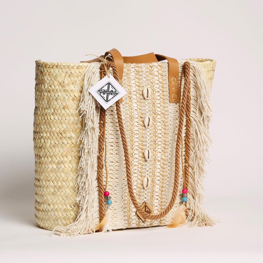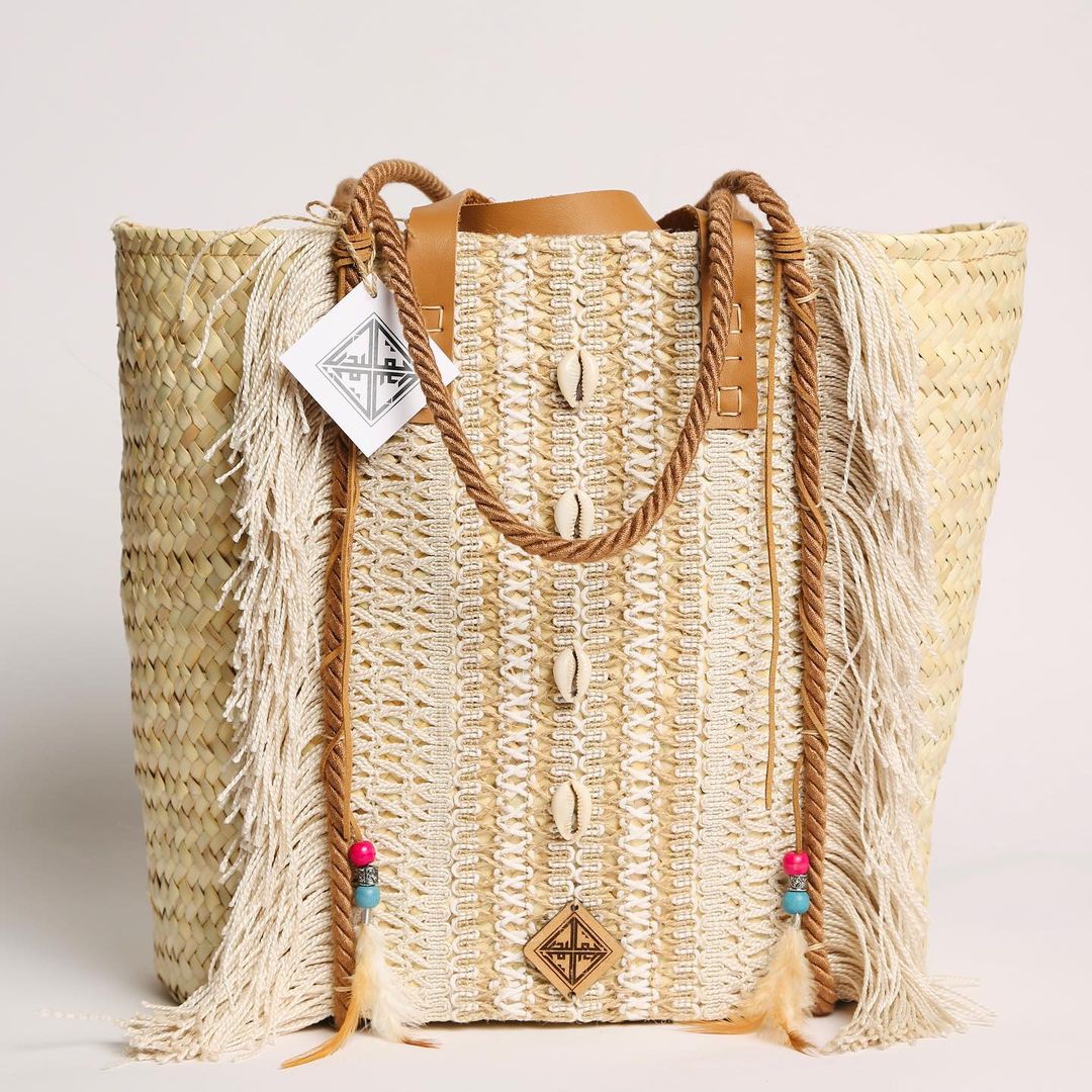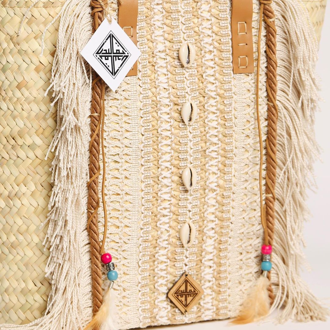 Son tressage naturel en feuilles de palmier s’orne d’un somptueux panneau central en macramé beige, décoré de cauris symbolisant la prospérité et la protection.